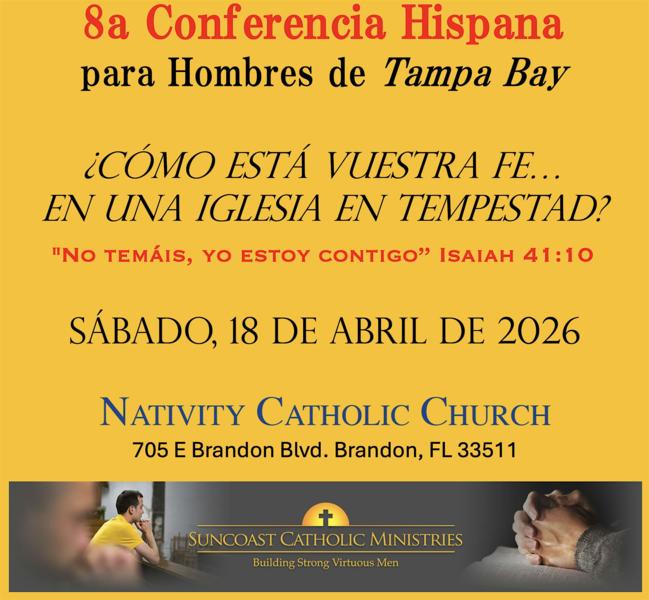 La Diócesis de St. Petersburg y Suncoast Catholic Ministries te invitan a asistir a la Octava conferencia anual hispana para hombres en Tampa Bay a celebrarse el Sábado 18 de Abril de 2026 en Nativity Catholic Church ubicada en Brandon, FL. El título de esta conferencia es